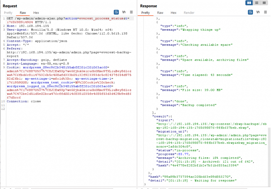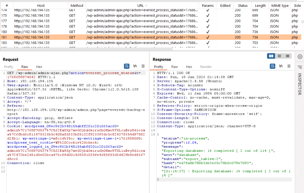 I setup the plugin and triggered a test backup. Once the backup completed, I went to Burp Suite’s HTTP history tab and noticed a large number of Ajax requests. Reviewing the Ajax requests showed they were triggering the wp_ajax_nopriv_everest_process_status Ajax hook.