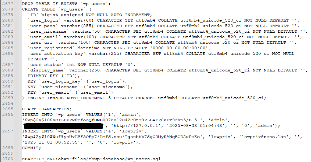 Backups were written to the folder /wp-content/ebwp-backups/. This directory is accessible to external visitors by visiting http://examplesite.com/wp-content/ebwp-backups/. Listing this directory’s contents is blocked, but an external visitor can download files in the folder provided the visitor knows the exact filename to request. No authentication is required to download a backup.