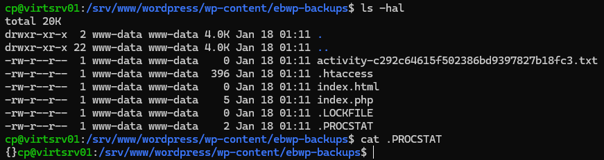 As it turned out, the Everest plugin’s backend code, responsible for creating a backup, would write a backup job’s status at regular intervals into the .PROCSTAT file once a backup job was started. The Ajax hook would read the file and return it to the frontend code, which would use the data to show the user the current backup job status. When the backup job was completed, the Everest plugin deleted the file.